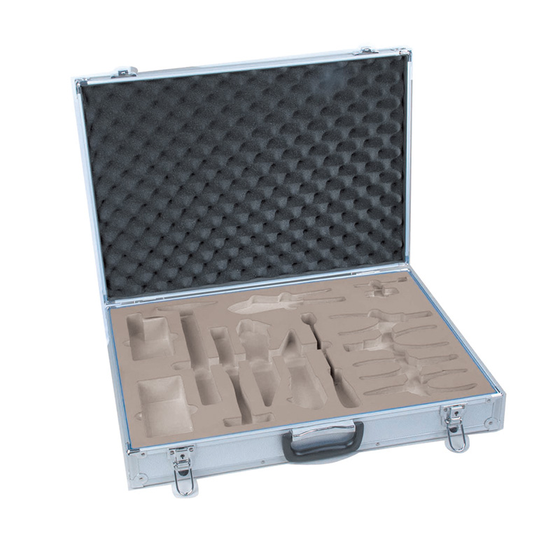Dafür Werkzeugkoffer aus Aluminium Es wurde so konzipiert, dass man darin Werkzeug aufbewahren kann. Der Schaumstoffausschnitt am Boden hat die Form von Zangen, Hämmern und Schraubenschlüsseln.